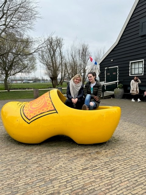 Bevor wir zurück nach Amsterdam fuhren, haben wir noch Zaanse Schans besucht. Zaanse Schans wird auch das Dorf der Mühlen und Händler genannt. Es ist das größte Freilichtmuseum Hollands und man kann die authentisch grünen holländischen Holzhäuser an Grachten sehen sowie viele Windmühlen. Hier waren wir auch in einem Holzschuhmuseum, in dem wir sehen konnten, wie die typisch holländischen Holzschuhe, die sogenannten „Klompen“, hergestellt werden.