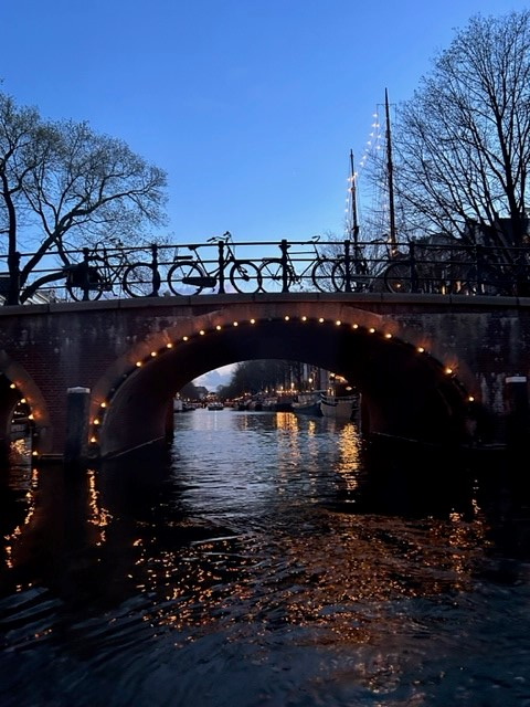 Am Abend fuhren wir in das Stadtzentrum rund um den Grachtengürtel und konnten erstmals die Postkartenidylle der Amsterdamer Grachten schnuppern. Wir hatten Glück mit dem Wetter, es war trocken, aber sehr kalt. Uns fiel auf, dass es vor Radfahrern nur so wimmelte und dass Amsterdam eine sehr junge und hippe Stadt ist mit viel Gastronomie. Wir unternahmen eine Grachtenfahrt durch das abendliche Amsterdam in einem überdachten Ausflugsboot. Wir zückten alle die Handys, um Bilder von den typischen kleinen Kanälen und den schiefen Grachtenhäusern zu machen. Zum Abschluss des ersten Tages besuchten wir gemeinsam eine Karaoke Bar und hatten dort wirklich Spaß beim gemeinsamen Singen und Getränken. Abends fielen wir erschöpft von der Anreise und den vielen neuen Eindrücken in die Betten.