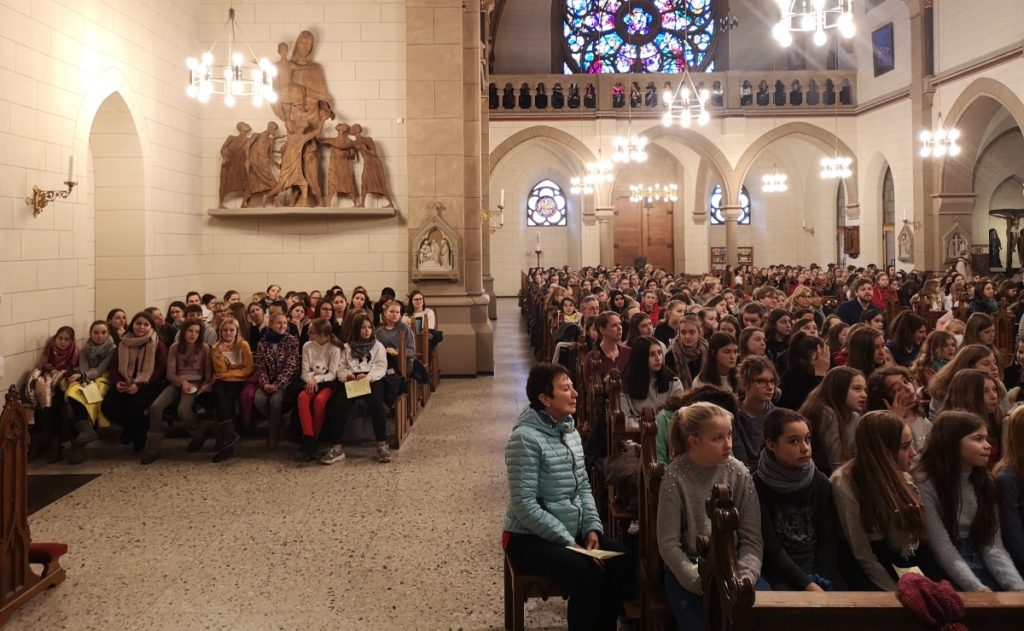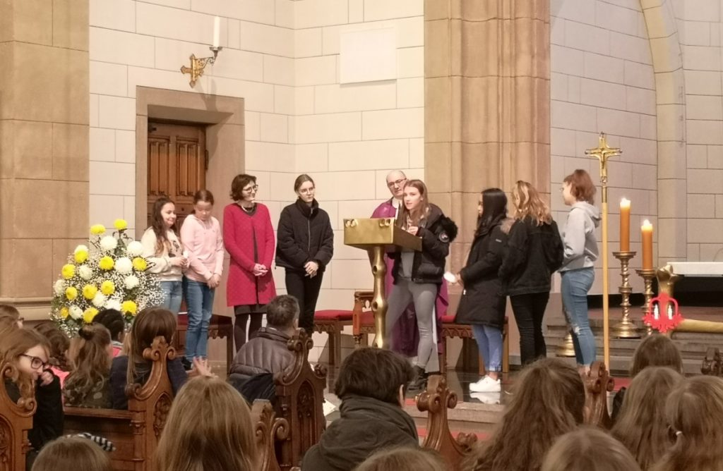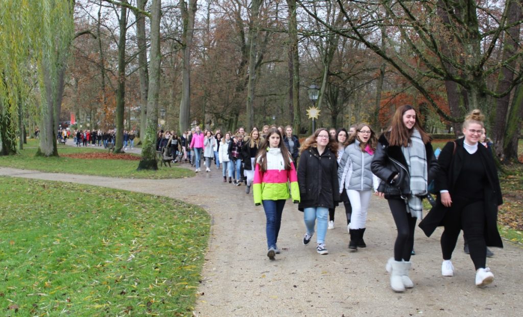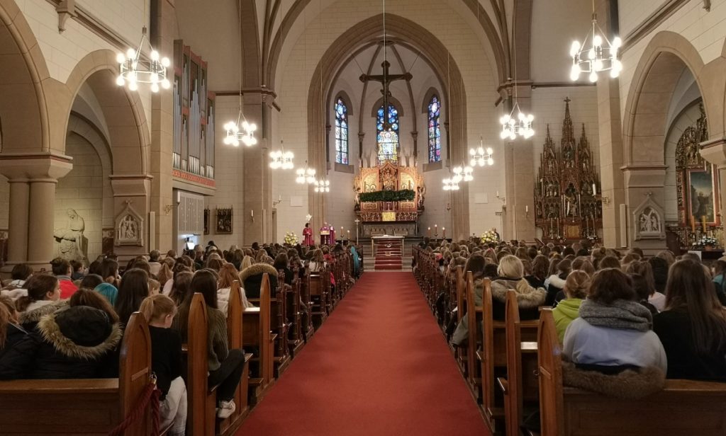 Über 400 Mädchen und das gesamte Kollegium machten sich heute um 9:30 Uhr auf den Weg vom Weinbergsweg durch den Kurpark zur Kirche St. Marien.