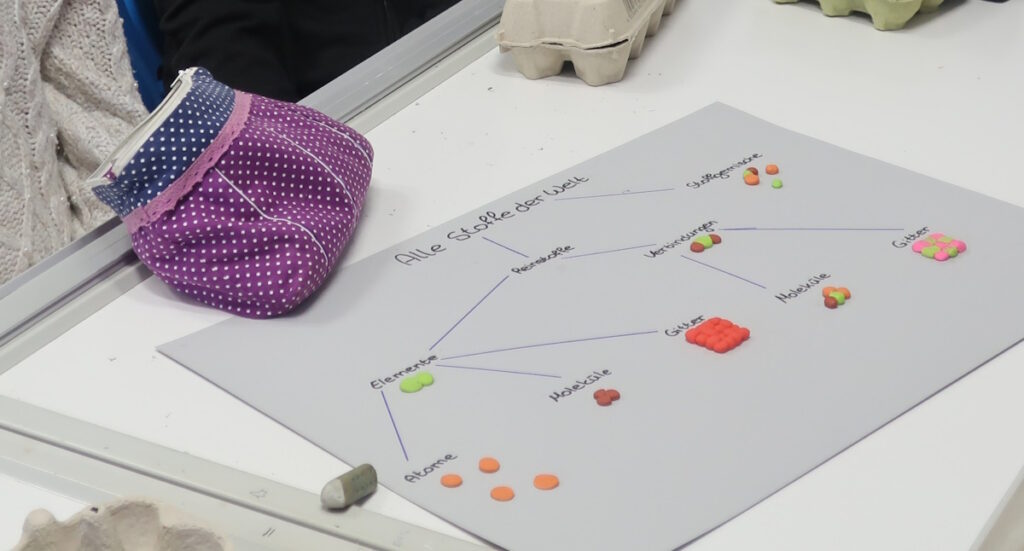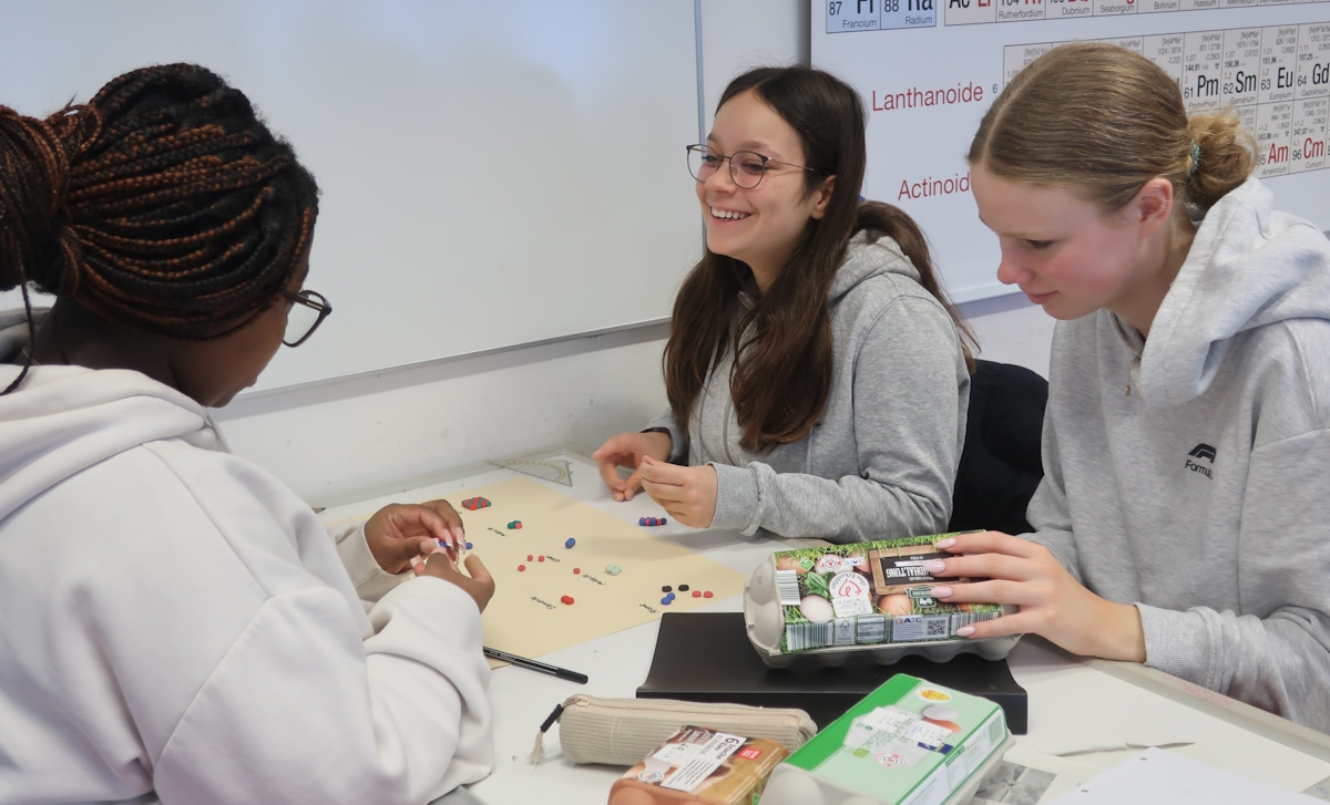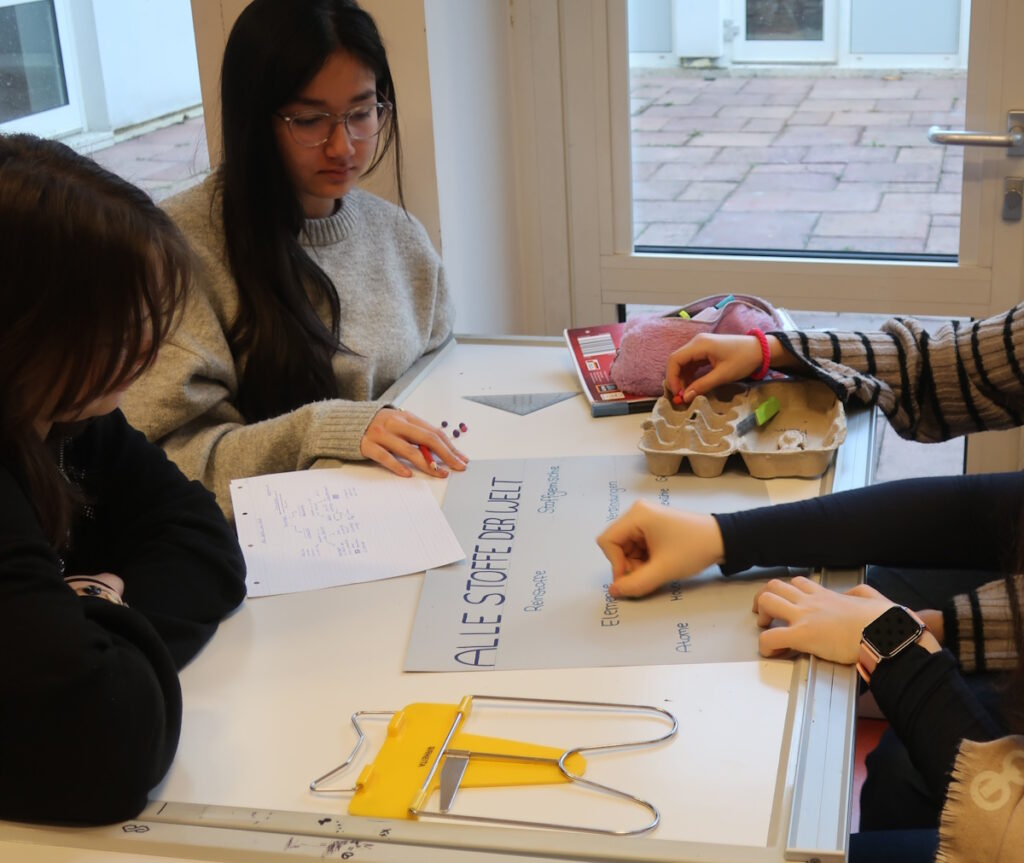 Im März 2026 war das Thema des Chemieunterrichts der Klasse 9a „Das Atommodell von Dalton“. Solche Modellvorstellungen sind nicht einfach zu verstehen, weil das, worum es geht, die Atome, nicht sichtbar sind. Daher ist das Vorstellungsvermögen herausgefordert. Um dieses theoretische und auch nicht einfache Thema für die Schülerinnen interessanter und leichter verständlich zu machen, haben die Mädchen der 9a Modelle von Atomen aus Knete hergestellt. Damit konnten sie wichtige Begriffe der Chemie wie Element, Verbindung, Atom und Molekül veranschaulichen und dadurch besser verstehen und behalten. Allen Beteiligten hat die Arbeit mit den Knetmodellen Spaß gemacht, was wir an der konzentrierten Arbeitsatmosphäre feststellen konnten.