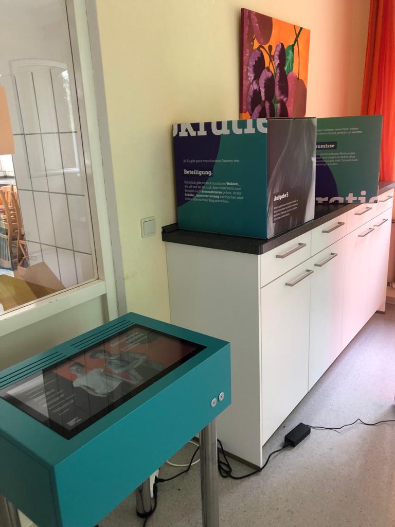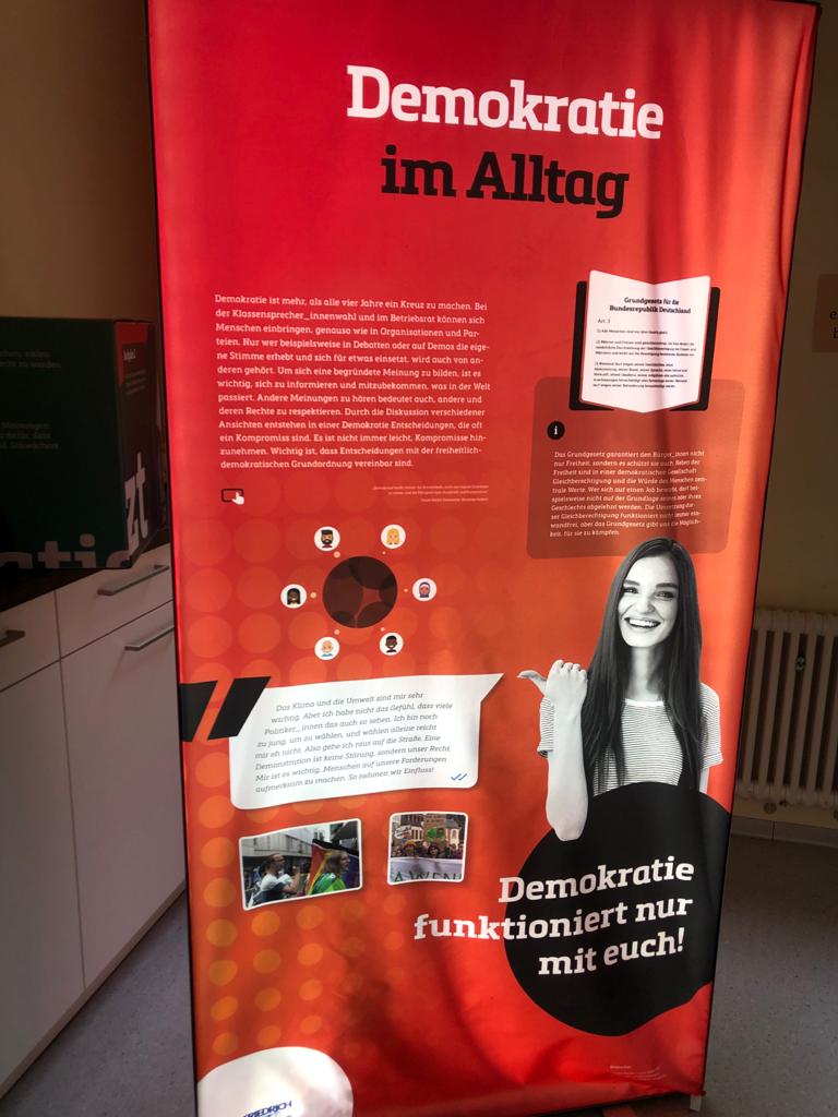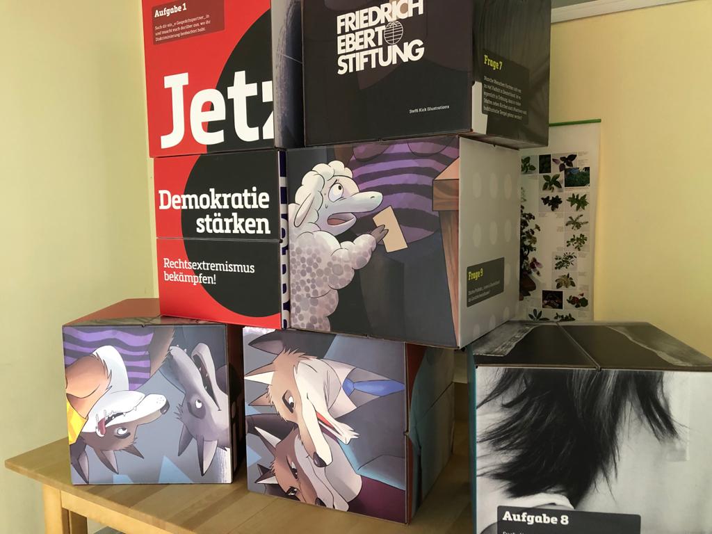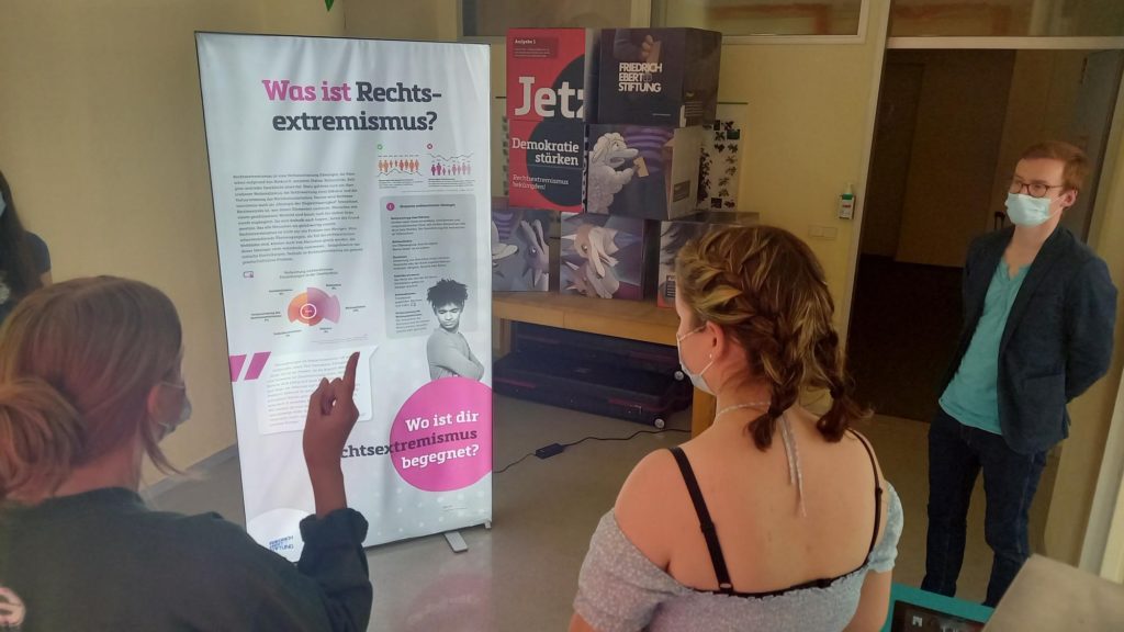 Die Ausstellung der Friedrich-Ebert-Stiftung zum Thema „Demokratie stärken – Rechtsextremismus bekämpfen“ steht allen Schülerinnen und natürlich auch den Lehrkräften der MWS zur individuellen oder gemeinsamen Besichtigung vom 14.06.-25.06.2021 zur Verfügung. Neben beleuchteten Stellwänden, die schwierige Begriffe erklären oder persönliche Erlebnisse mit Rassismus oder Rechtsextremismus von Jugendlichen aufgreifen, enthält die interaktive Ausstellung auch zahlreiche Sitzwürfel mit Rechercheaufträgen, denen an einem Medientisch nachgegangen werden kann. Der Medientisch selbst wiederum enthält eine Vielfalt an Fotos, Texten, Videos und kleinen Quizfragen rund um das Thema Rechtsextremismus und seine verschiedenen Formen der Ausprägung. Durch ihre Themen- und Medienvielfältigkeit kann die Ausstellung von älteren sowie jüngeren Jahrgängen besucht werden.