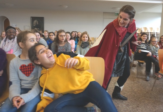 Besonders für die Mädchen der fünften Klasse war das Theaterstück sprachlich eine Herausforderung. Jedoch diente das im Vorfeld zur Verfügung gestellte Skript einer guten Vorbereitung sowie als Grundlage zur Erarbeitung theaterpädagogischer Ansätze, sodass sie dem Geschehen aufmerksam folgen konnten.