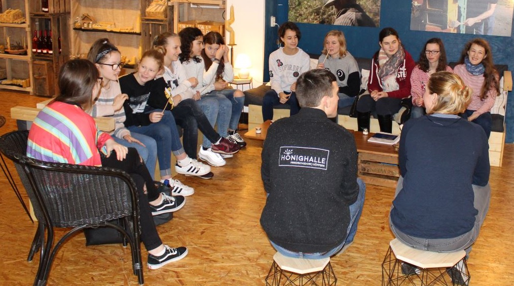 Mitinhaber Marek Schiesser, seit 2017 ausgebildeter Imker, und Lenka Rupp gaben einen lehrreichen Einblick in das Leben der Biene, die Gewinnung von Honig sowie die Problematik des weltweit massiven Bienenverlusts. Die Achtklässlerinnen staunten nicht schlecht, als sie hörten, dass eine Honigbiene zur Gewinnung eines Pfunds Honig eine Strecke von 3,5 Mal um die Erde bewältigen muss. Wissenswert war für die Schülerinnen sicher auch der Hinweis zum Einsatz des homöopathischen Mittels Apis (dt.: Biene) zur Behandlung von Insektenstichen. Bei der anschließenden Verkostung war nun die gustatorische Wahrnehmung der Schülerinnen gefragt. Von blumig über fruchtig bis zu holzig reichte das Spektrum der Geschmacksnuancen der sechs Honigproben. Auch die Farbe und die Konsistenz wurden unter die Lupe genommen. Ist der Honig flüssig, enthält er mehr Fruktose als Glukose. Als krönenden Abschluss durften sich die Mädchen ein Gläschen Honig abfüllen und mit nach Hause nehmen.