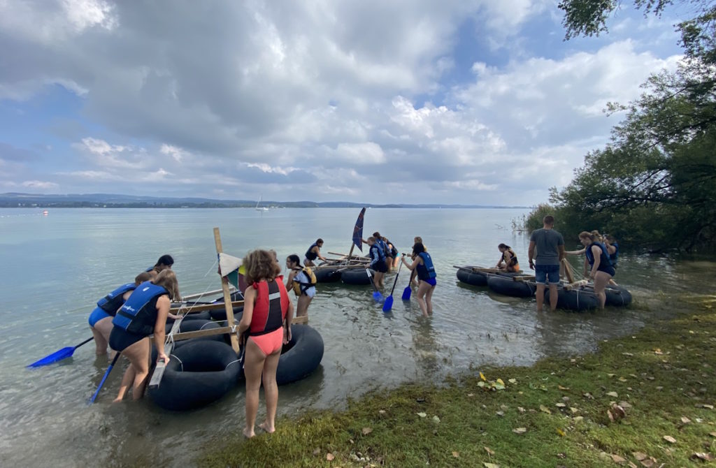 Das Highlight der Klassenfahrt fand am Strandbad Moos bei Iznang statt. Dort wurden wir von zwei Teamleitern namens Kai und Manuel begrüßt. Sie gaben uns je Gruppe einen aufgeblasenen Autoreifen, Schnur, zwei lange und zwei kurze Bretter. Daraus sollten wir jeweils ein Floß bauen, das 6-7 Schülerinnen transportieren kann. Davor hat auch jede Gruppe ein Segel gebastelt, welches am Mast montiert wurde. Wir haben es geschafft – es ist niemand unter gegangen – auch wenn dann natürlich der See zum Planschen genutzt wurde – Sonne gab es genug.