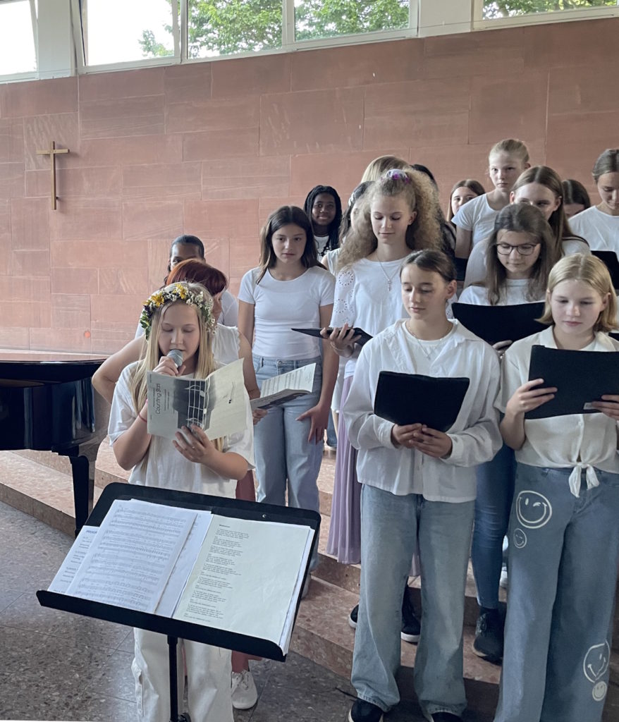 Beim Mittsommersingen trat der gesamte Jahrgang 7 auf und beeindruckte mit einem fröhlichen und vielfältigen Programm. Das diesjährige Motto „Frühsommerlich“ spiegelte sich in den liebevoll ausgewählten Stücken wider, darunter das finnische Volkslied „Birkenring“ und das schottische Lied „Mairi’s Wedding“, sowie der Sea Shanty „Wellerman“.