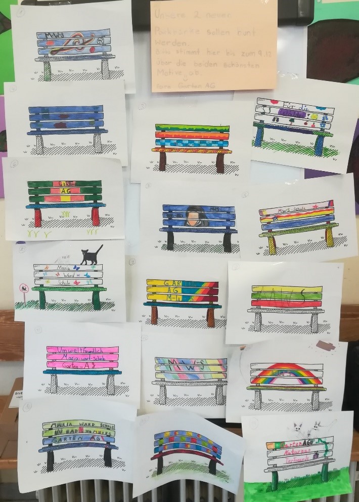Viele Schülerinnen unserer Schule wünschten sich mehr Sitzmöglichkeiten auf unserem wunderschönen Gartengelände. Die Umwelt und Garten AG hat daher 2 Parkbänke angeschafft, die wir in den nächsten AG Stunden bemalen wollen. Alle Teilnehmerinnen der Garten AG brachten ihre Vorschläge ein (siehe Bild).