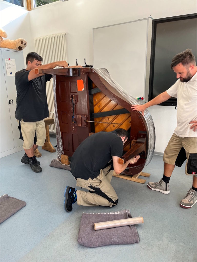 Wir haben den Flügel bereits getestet, er klingt ganz wunderbar! Der Musikpavillon erfährt mit dem Flügel eine große Aufwertung und wurde auch von den Schülerinnen gespannt erwartet. Der Aufbau war aufregend: hochkant und ohne Beine kam der Flügel an und wurde dann durch Mitarbeiter der Firma Fleckner professionell aufgebaut.