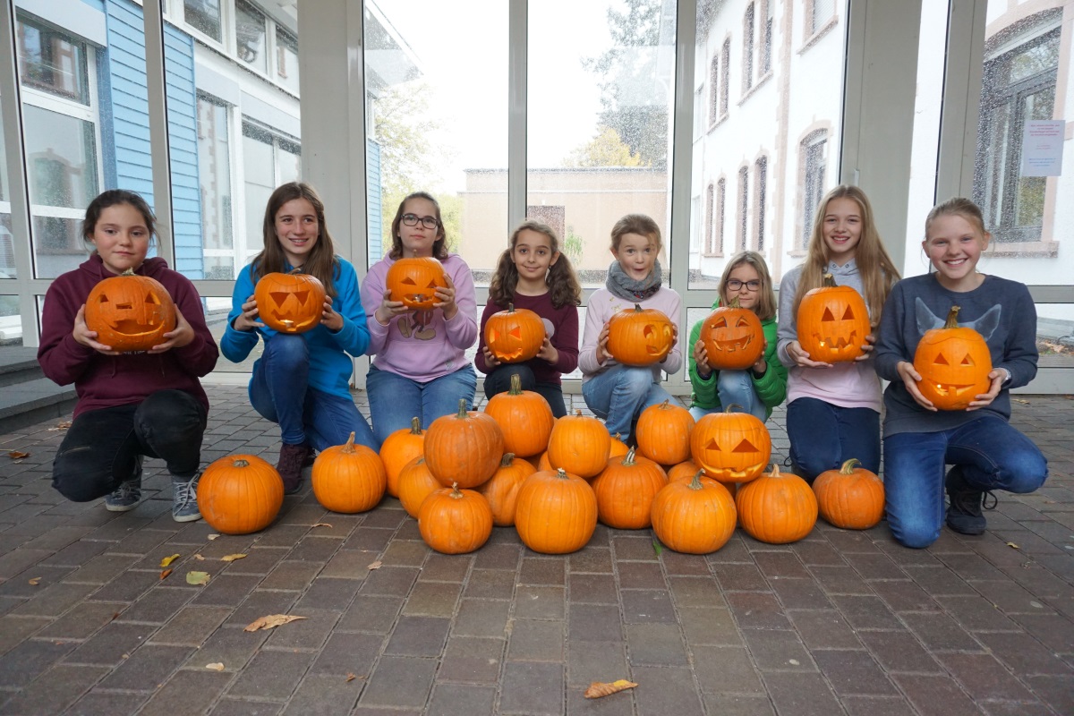 Bei uns stand heute nach der sechsten Unterrichtsstunde ein großes Kürbisschnitzen auf dem Plan. Die jungen Schülerinnen schnitzten was das Zeug hält. Mit ganzem Einsatz und Feinarbeit schnitten sie gruselige Grimassen in die kleinen Kürbisköpfe.
