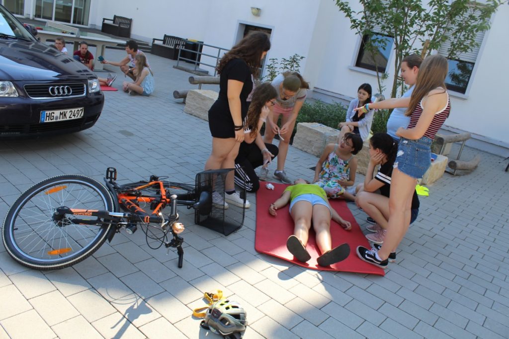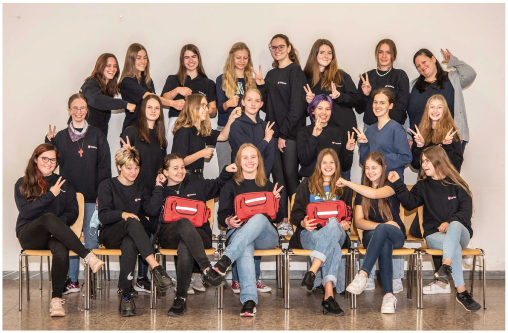 Treffen: Wöchentlich kommen wir für eine Schulstunde am Nachmittag nach dem Unterricht zusammen. Wir besprechen aktuelle Vorfälle und üben Erste Hilfe theoretisch und praktisch. Die AG-Teilnehmerinnen halten alles in einem eigenen Ordner schriftlich fest.