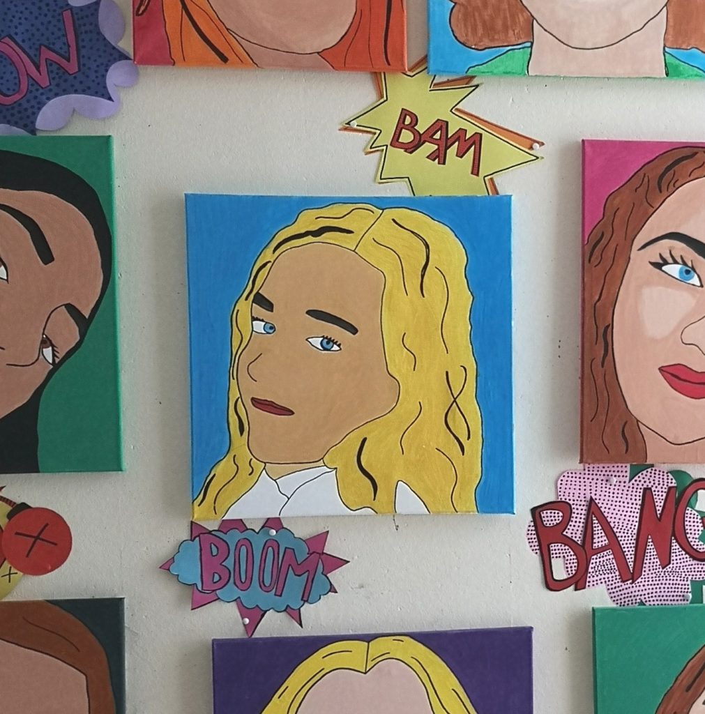 Wer durch das Treppenhaus der MWS geht, dem fallen sofort die knallig-bunten Bilder der Schülerinnen aus der 10c auf. Nachdem sich die Mädchen in einer vorangegangenen Arbeit mit einer Bleistift-Zeichnung porträtiert hatten, ging es bei dieser Aufgabe darum, das eigene Gesicht im Stil des Pop-Art zu verfremden: kräftige Farbe, flächige Struktur, mit schwarzen Konturen akzentuiert. Passend dazu gestalteten die Schülerinnen comichafte Sprechblasen („Onomatopoesie“), die der plakativen Ausstellung das i-Tüpfelchen aufsetzen. WOW!“
