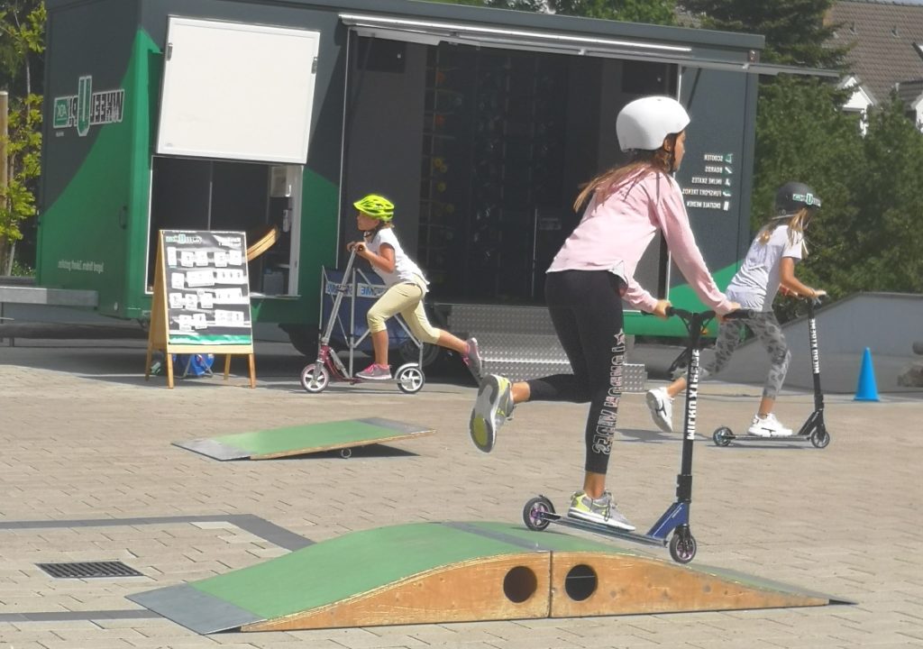 Voll beladen mit Waveboards, Scooter und Inline-Skates sowie entsprechender Schutzausrüstung und Lernmaterial. Eine Woche lang lädt er zum Ausprobieren, aber auch zum Perfektionieren von bereits erprobten Tricks ein.