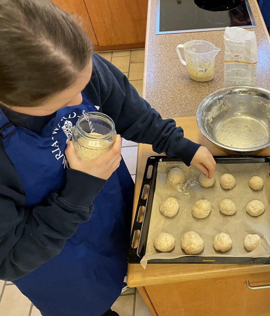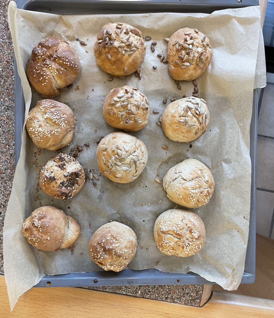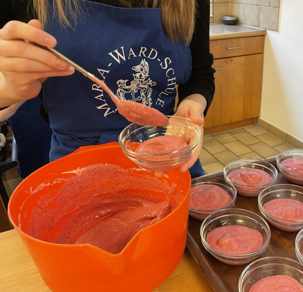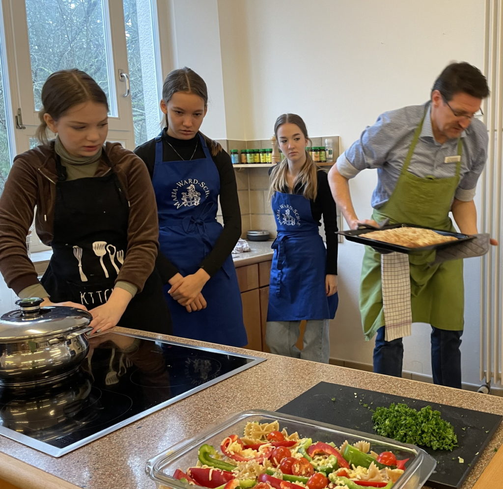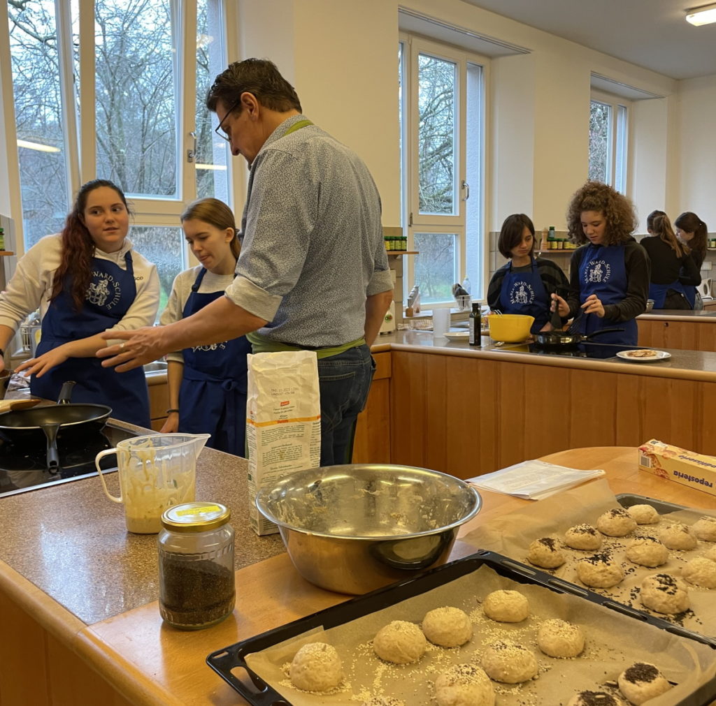 Anschließend wurden die Schülerinnen in drei Gruppen aufgeteilt, bezogen ihre Kochkojen und machten sich mit dem Inventar vertraut. Alle Zutaten standen bereits auf einem separaten Tisch bereit. Unter Anweisung des Seminarleiters schritten sie nun zur Tat. 12 verschiedene Gerichte, darunter einen Nudelauflauf, Gemüsetaler, ein Fladenbrot, verschiedene Dips und ein Himbeer-Dessert, galt es zu kochen, zu backen und zuzubereiten.